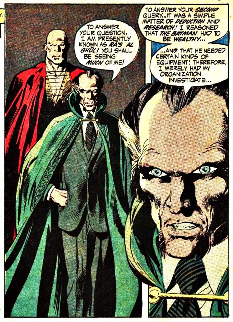 Ra´s al Ghul apareció por primera vez en Batman #232, de junio de 1971. Fue una de las obras más importantes del dúo formado por el escritor Denny O´Neill y el dibujante Neal Adams. Ambos se habían propuesto recuperar las raíces del Hombre Murciélago, después de que la serie de televisión de Adam West y Burt Ward de los años 60 hubiera desvirtuado sus comics. Durante su larga etapa con el personaje, O´Neill y Adams asumieron de nuevo que Batman debía actuar siempre como un justiciero nocturno, con un código de valores estricto y unas grandes capacidades como detective. Volvía a ser una mezcla entre La Sombra y Sherlock Holmes, movido por una creencia fanática en su papel como héroe, que persigue a los malvados del mundo para que no haya más víctimas como sus padres.