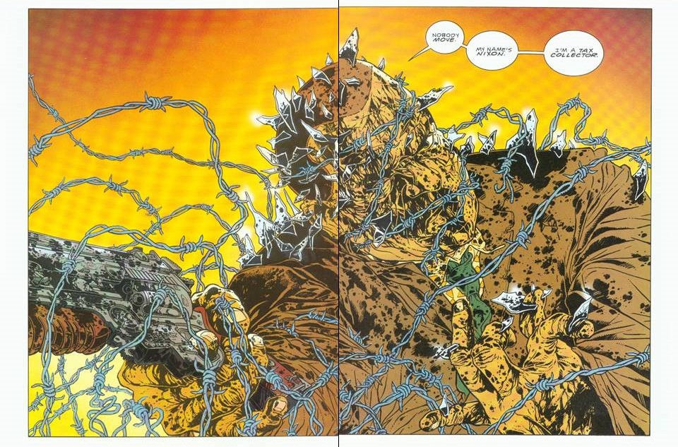 En 1990, Frank Miller ya había sacudido el mercado del cómic estadounidense con historias tan significativas como Daredevil, Lobezno: Honor, Ronin, Batman: El regreso del Caballero Oscuro, Elektra: Asesina, Batman: Año uno, Elektra lives again o Give me liberty. Se encontraba en el apogeo de su carrera, y eso que aún le faltaba por acometer retos tan espectaculares como 300 o toda la saga de Sin City, que revolucionarían no solo el cómic, sino también el mundo del cine. Por esa época, Miller era el nuevo genio del noveno arte, un creador que entendía los pilares básicos del género y los llevaba en direcciones nuevas, cargado además de un humor ácido y un macarrismo que parecían más típicos de autores británicos como Alan Moore o Grant Morrison que de un tipo de Maryland. Sin embargo, es cierto que Miller proviene de una familia de católicos irlandeses y que en su infancia y juventud leyó una cantidad inmensa de cómics que después convirtió en un trabajo. De hecho, al hablar de la manera en la que había creado una de sus obras principales, dijo: «Cuando comencé Sin City, me di cuenta de que los cómics estadounidenses e ingleses eran demasiado prolijos, demasiado estreñidos, y los cómics japoneses demasiado vacíos. Entonces traté de hacer un híbrido». Ese es Miller, el estudioso del cómic que trata de romper fronteras.