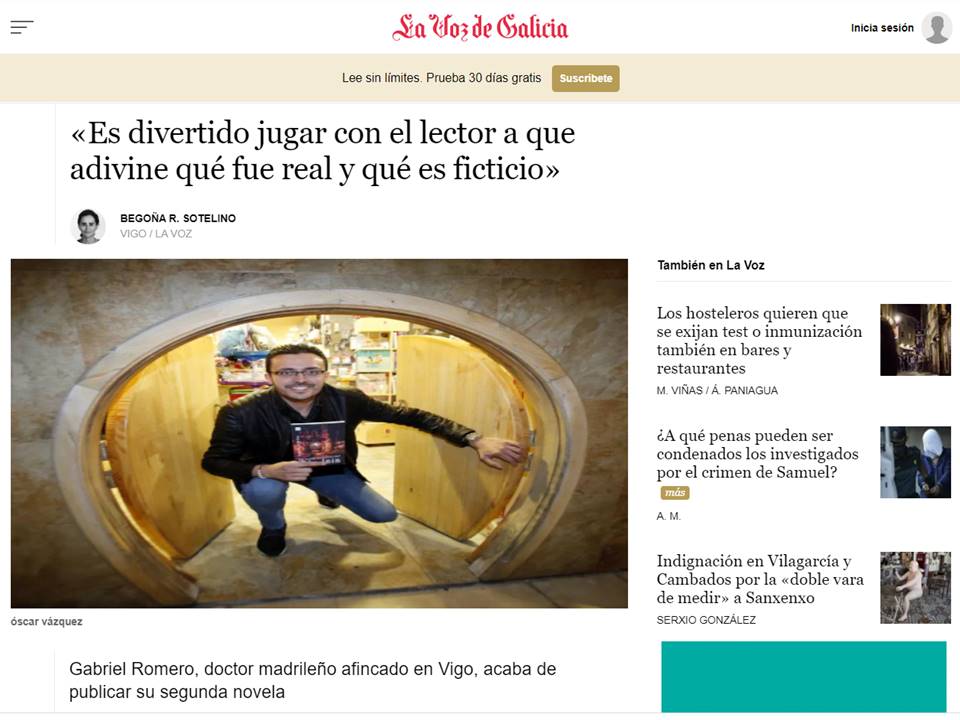 El 3 de enero de 2017 salió publicada una extensa entrevista que hice para La Voz de Galicia, y que aparece en este enlace. Begoña R. Sotelino logró, aún no sé cómo, transformar el millón de locuras que salieron de mi boca en un precioso texto que incluso tiene sentido. Gracias a ella parezco ocurrente, intelectual y divertido, en vez de mi habitual verborrea caótica.