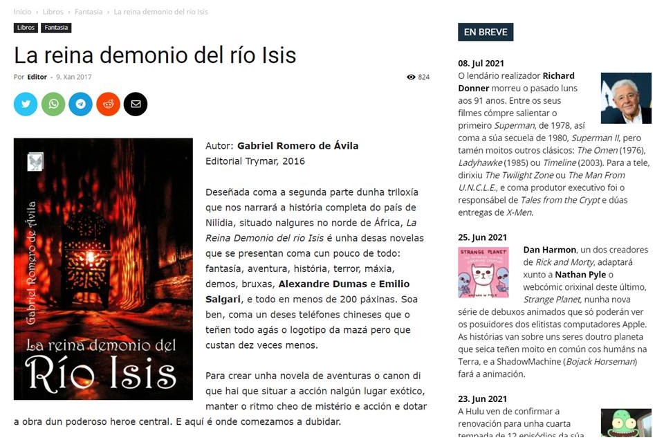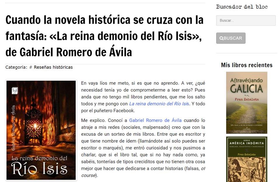 El 17 de diciembre de 2016 apareció en el suplemento cultural de Faro de Vigo el primer comentario acerca de La reina demonio del río Isis. Era un artículo obra de Salvador Rodríguez que dio a conocer la novela al gran público. Una delicia leer los comentarios de Salvador sobre esta loca aventura africana.