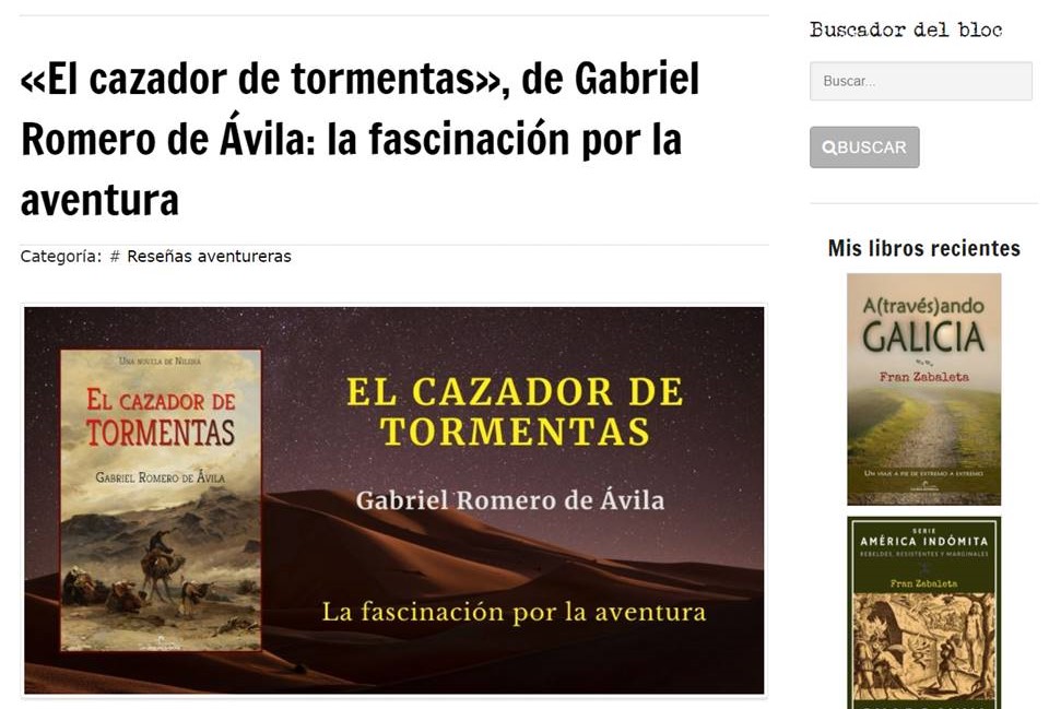 En la primavera de 2021 apareció mi nueva obra, El cazador de tormentas, que también recibió un trato amoroso por parte de la prensa. El primero que quiso escribir sobre ella fue su propio editor, Fran Zabaleta, que además es uno de los más importantes escritores de novela histórica y libros de viajes de este país. En su página web hablaba de esta forma de la novela.