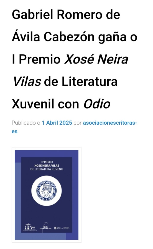 El 1 de abril de 2025 saltó la gran noticia: me habían concedido el I Premio Xosé Neira Vilas de Literatura Xuvenil, tal y como anunció Editorial Galaxia en su página web. Puedes verlo aquí.